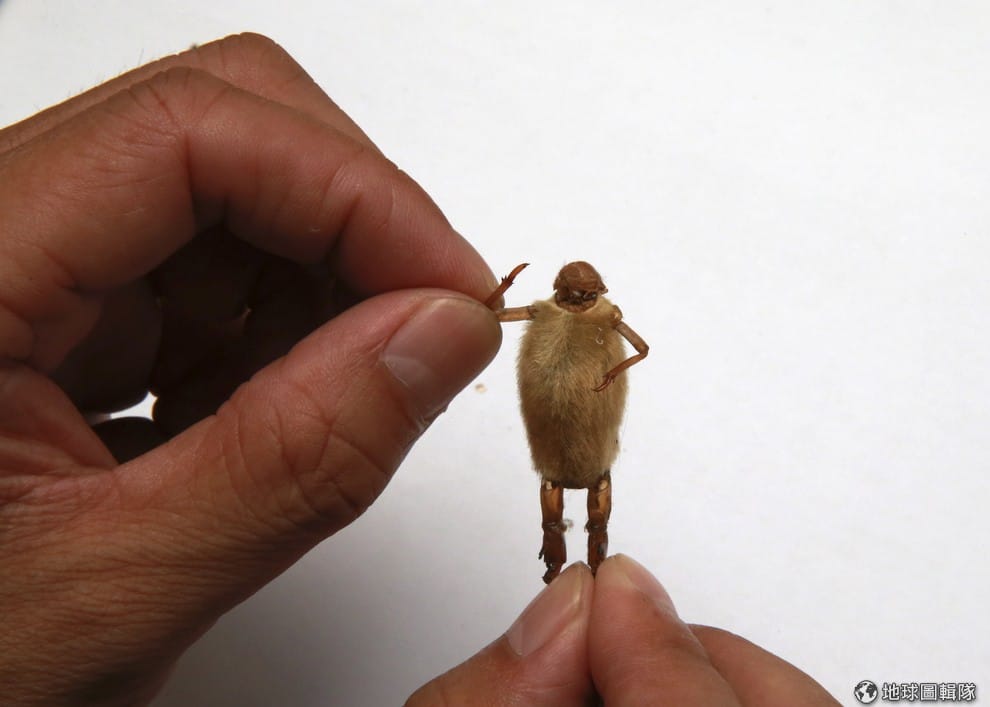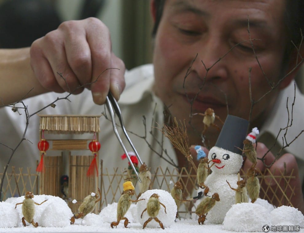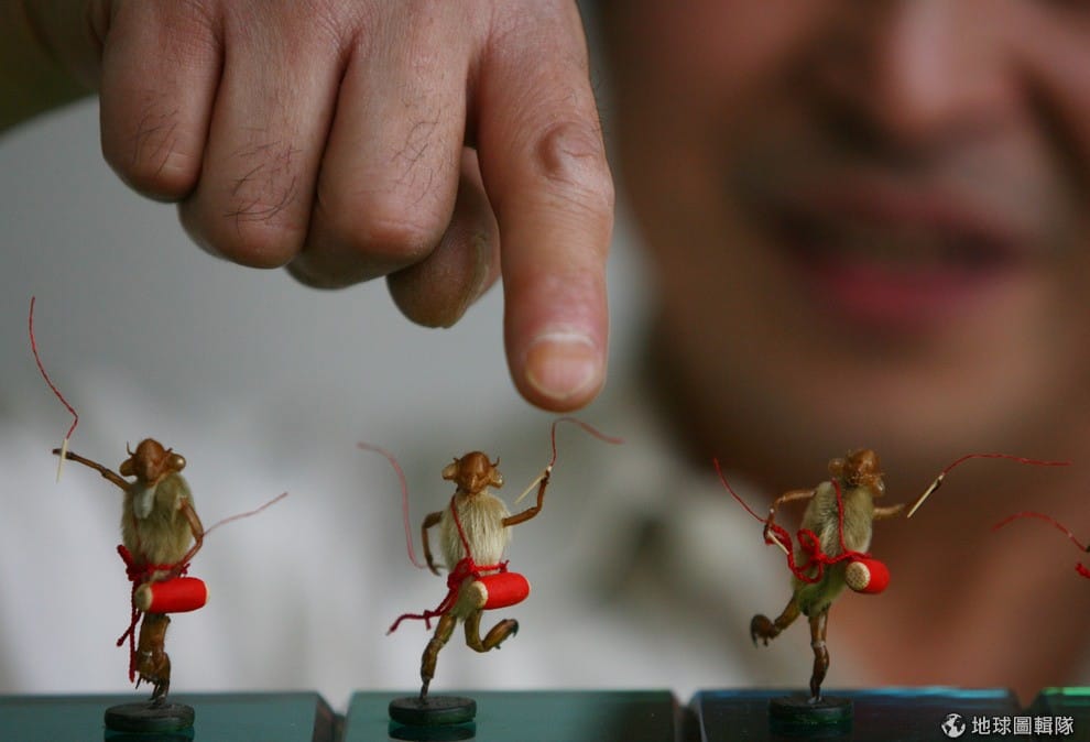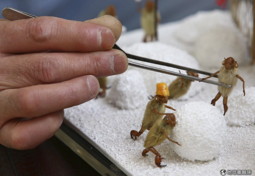 路透社從蟬殼上取下蟬的腳,再安裝到毛猴小人身上做成小人的手。