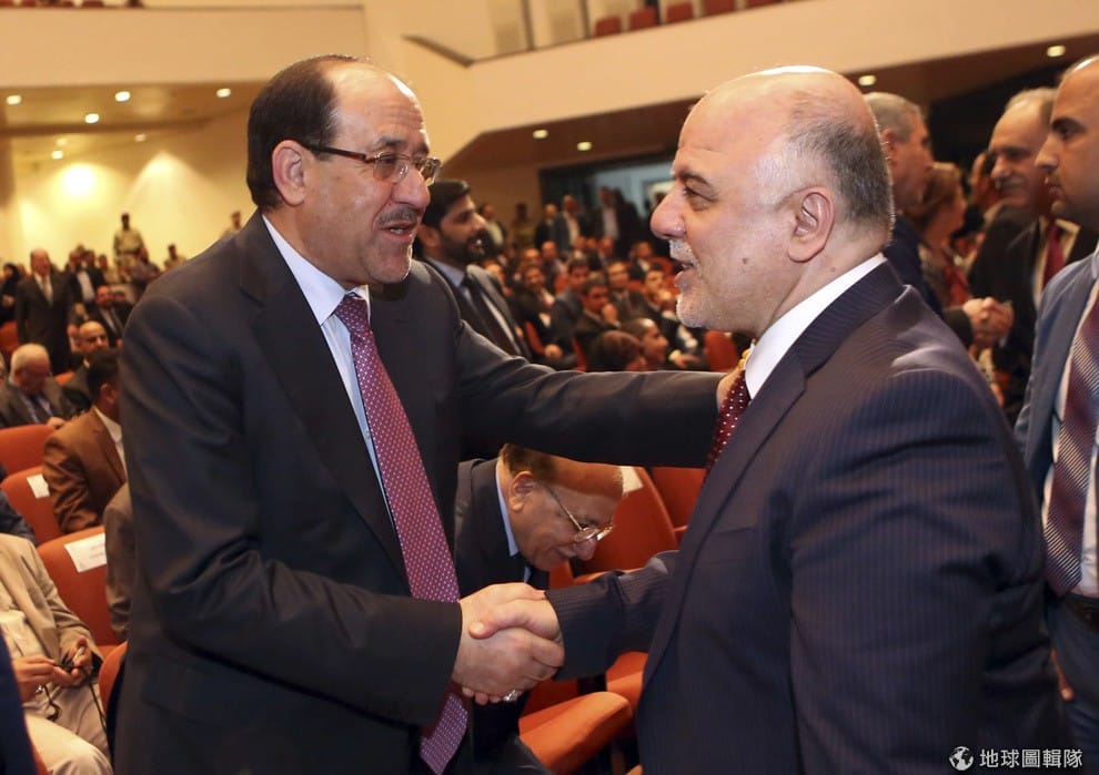 伊拉克新總理阿巴迪(右)與前總理馬利基互相握手,馬利基卸任後接任伊拉克的副總統。