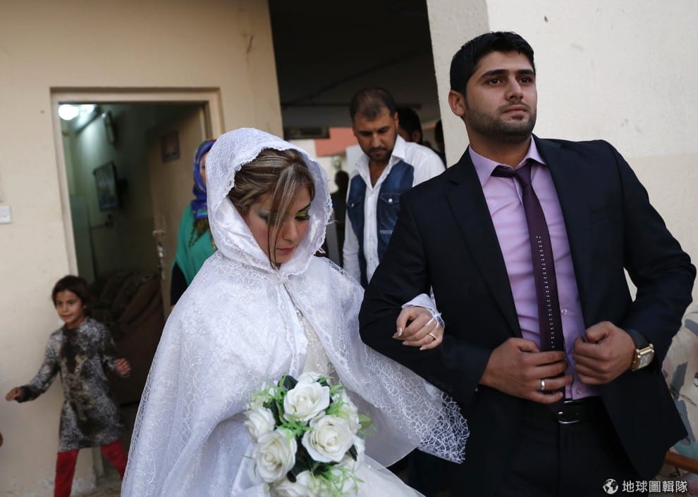 25歲的尤西夫(Mohammed Harith Youssif)牽著他20歲的太太黎姆(Reem Ahmed)往前走,他們夫妻倆分屬不同的伊斯蘭教派系,尤西夫屬於什葉派,而梨姆屬於遜尼派,兩人因為「伊斯蘭國」攻擊逃離摩蘇爾,他們在9月1日這天舉辦了婚禮。