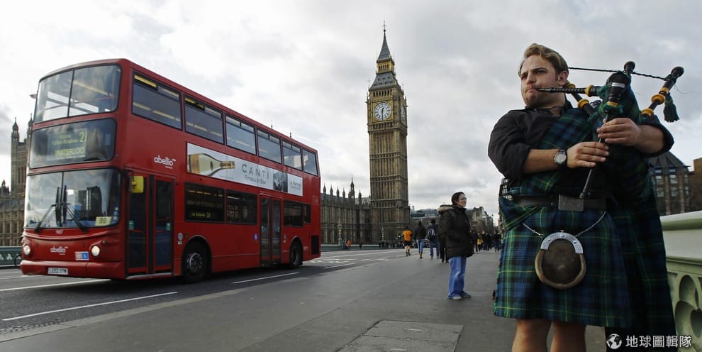 照片中的英國民眾演奏的就是有名的蘇格蘭風笛。