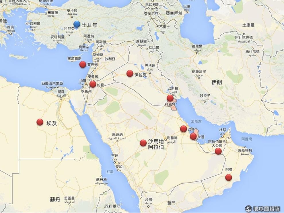 如上圖紅點標示,發出聲明的10個阿拉伯國家分別是沙烏地阿拉伯、巴林、埃及、伊拉克、約旦、科威特、黎巴嫩、阿曼、卡達以及阿拉伯聯合大公國。