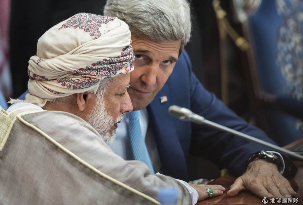阿曼外交部長阿布杜拉(左,Yusuf Bin Alawi bin Abdullah)與美國國務卿凱瑞在會議上說話。