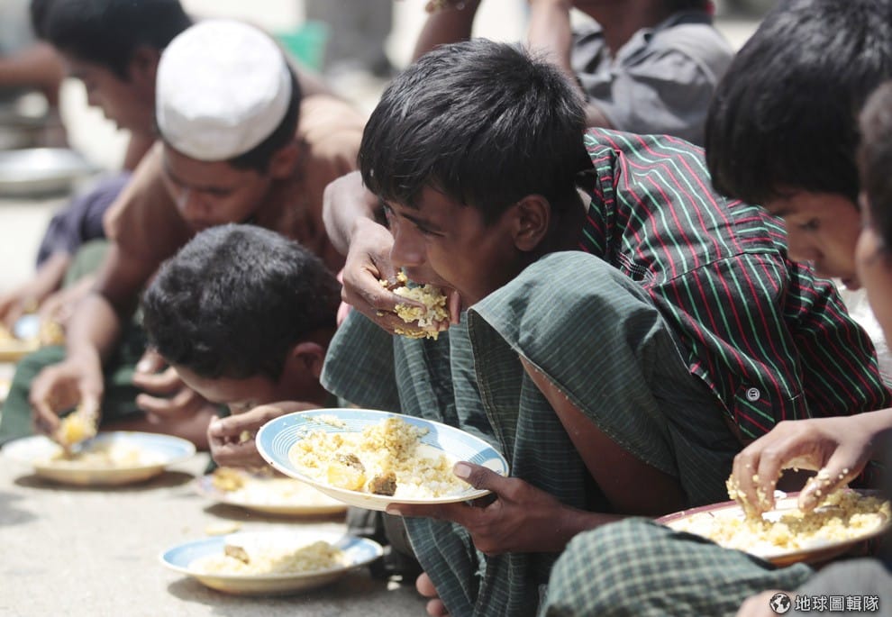 世界各地都有逃離戰亂家園的人們,照片中是在緬甸受到迫害的洛興雅人,他們逃到孟加拉一帶正在吃著當地員警給的食物