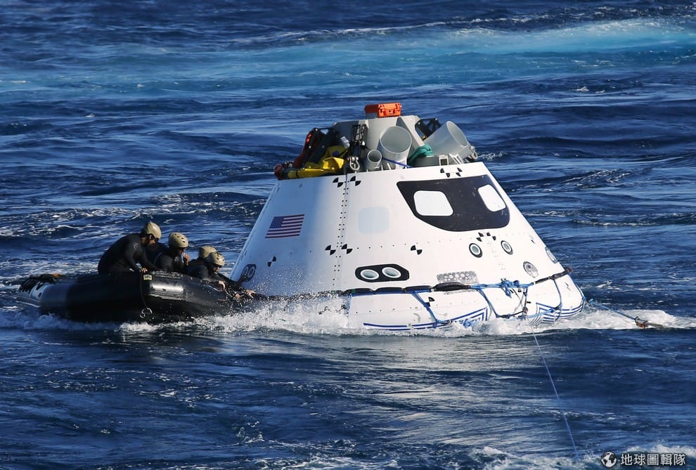 NASA的測試型獵戶座太空船,美國的海軍正搭著小船調整拉著獵戶座的繩索,準備把它帶回船上。