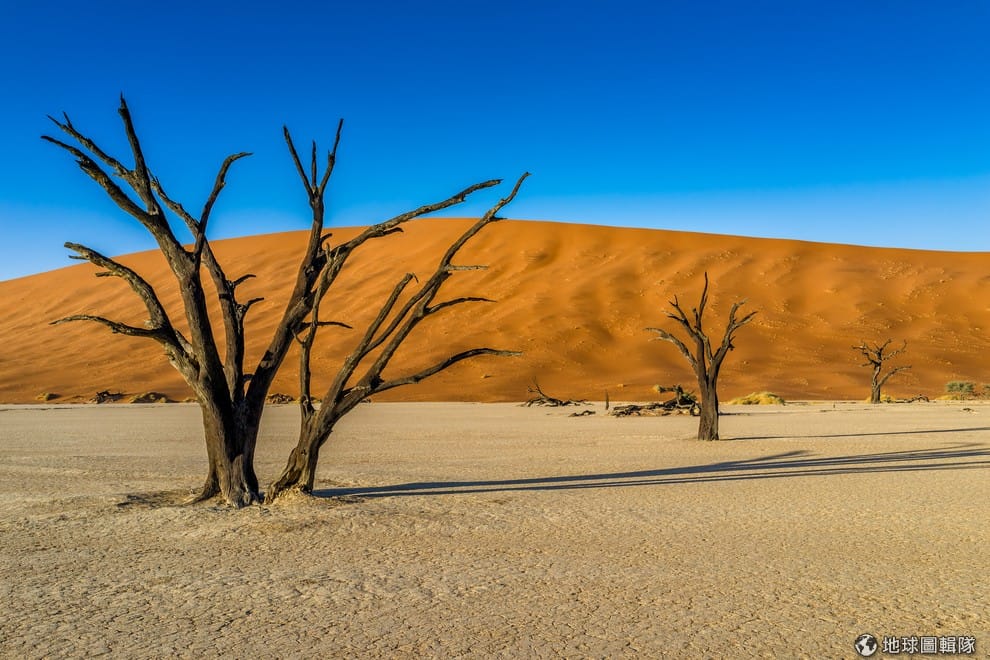超過900歲的古樹,一個個錯落在乾涸的土地上,知名的「死亡谷」(Deadvlei)就位在納米比亞蘇索斯維利鹽田(Sossusvlei)裡,它的名字Deadvlei在英文中意指Dead Marsh,也就是「死亡沼地」。大約在900至1000年前,這裡歷經了一場惡劣的氣候變化,樹木頓時失去賴以維生的水源後,就漸漸乾涸估死,再加上烈日曝曬下,讓樹木成了一個個焦炭的外貌。