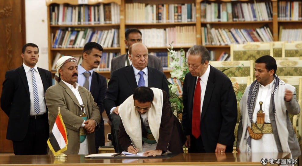 胡西組織的代表馬謝(中間彎腰的男性,Mehdi Al-Mashat)正在簽署協定,在他旁邊的是聯合國特別大使比諾瑪(右二,Jamal Benomar)和葉門總統哈迪(中間藍色領帶的男性,Abd-Rabbu Mansour Hadi)。