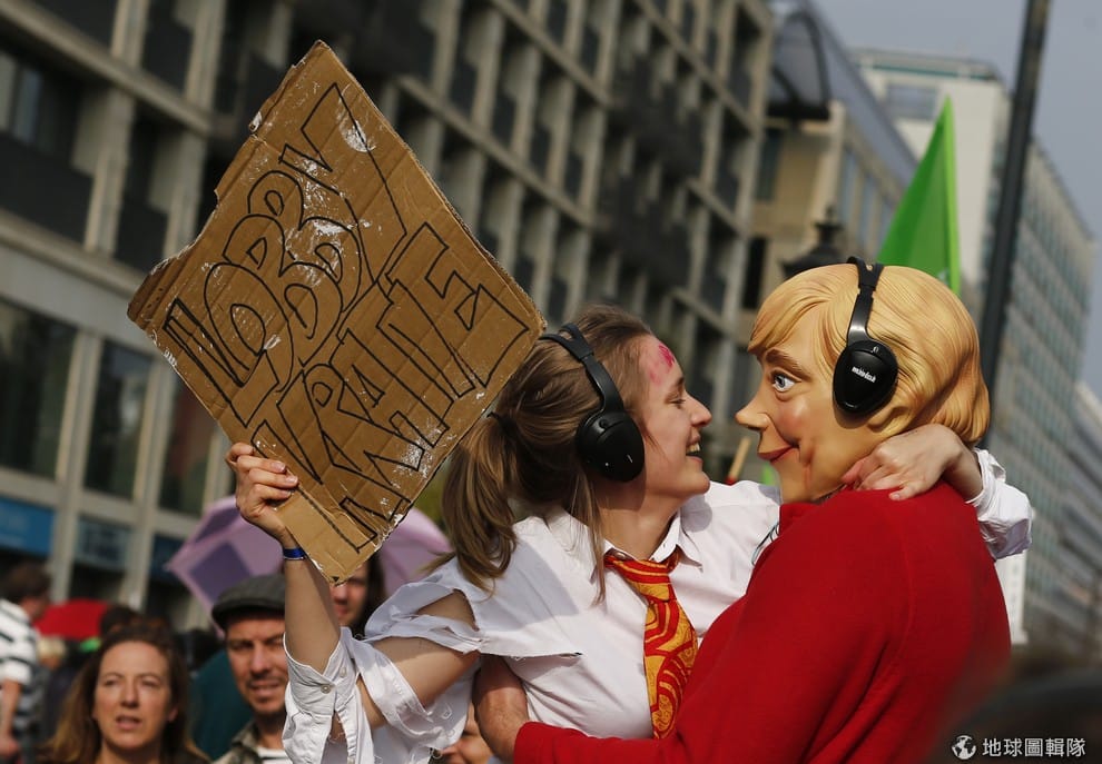 路透社拿著標語的女性親吻頭上戴著德國總理梅克爾面具的人。
