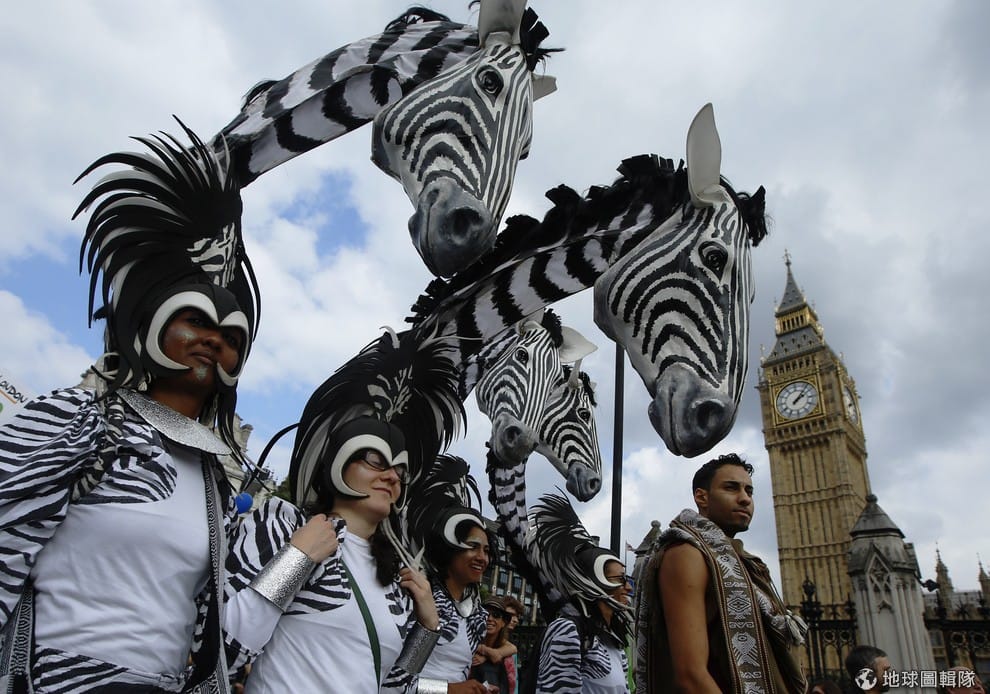 扮成斑馬的民眾在倫敦的知名景點大笨鐘附近遊行。