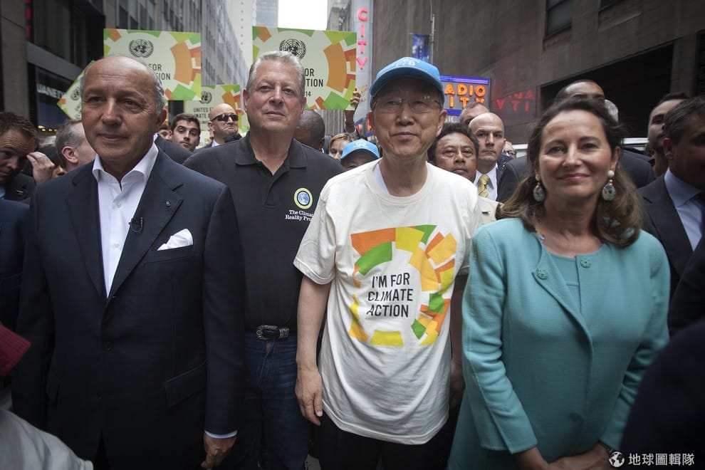 法國外交部長法比斯(左一,Laurent Fabius)、前美國總統候選人高爾(左二)、聯合國秘書長潘基文(右二)、法國環境部部長蘿瑤(右一,Segolene Royal)。
