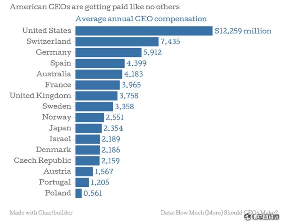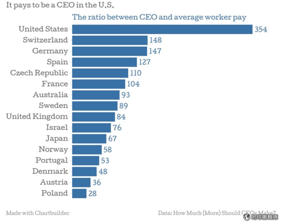 合作夥伴該報導認為,一般美國人無法想像他們的老闆收入是多麼驚人,是這項認知調查與事實差距過大的原因之一。財富 500 大企業執行長年薪高達 1,200 萬美元,比第二高的瑞士企業執行長高 500 萬美元,比德國企業執行長高兩倍。相較於美國企業執行長收入與員工薪資有 354 倍的差距,瑞士企業執行長與員工薪資差距為 148 倍,德國為 147 倍,西班牙為 127 倍。
