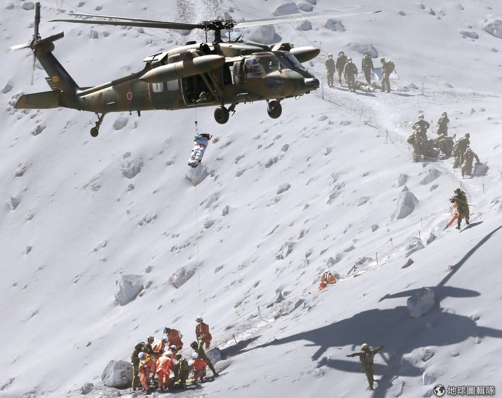 日本自衛隊軍人和消防員上山搶救傷患,他們用擔架把人送下山。