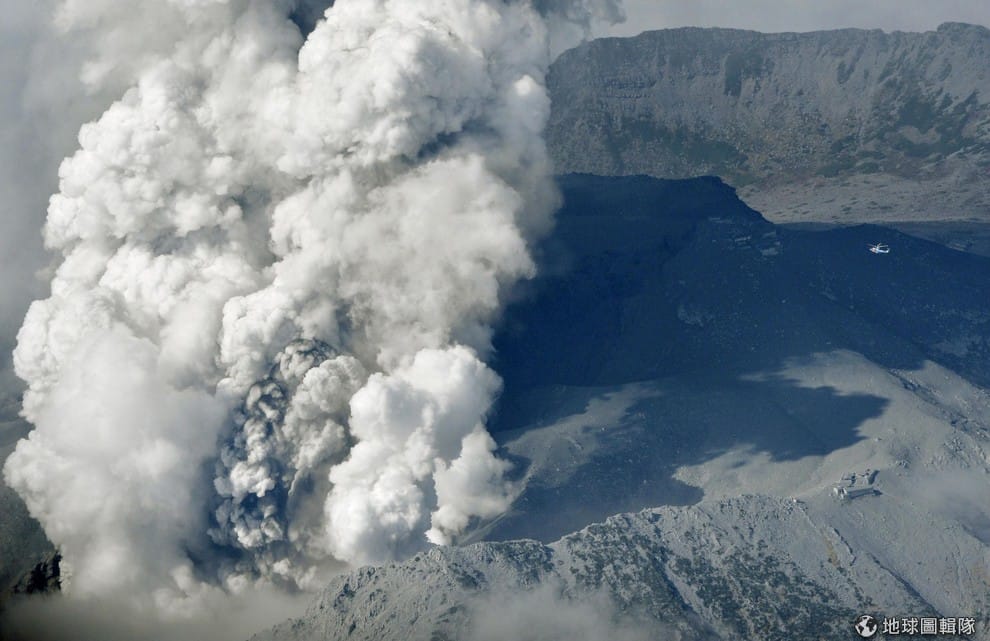 路透社照片中,可以看到右上角有一架直升機靠近還在冒煙的御嶽山。