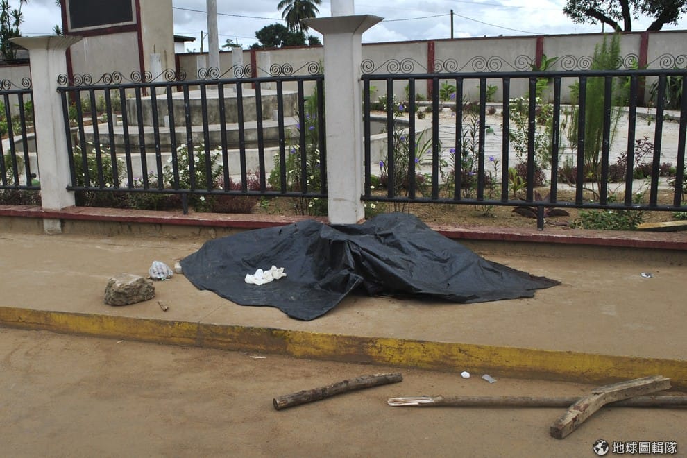 賴比瑞亞當地街頭上,一具蓋上防水布的屍體正等待人員檢查是否有染上伊波拉病毒,當地官員表示,這是現在賴比瑞亞境內的標準程序。