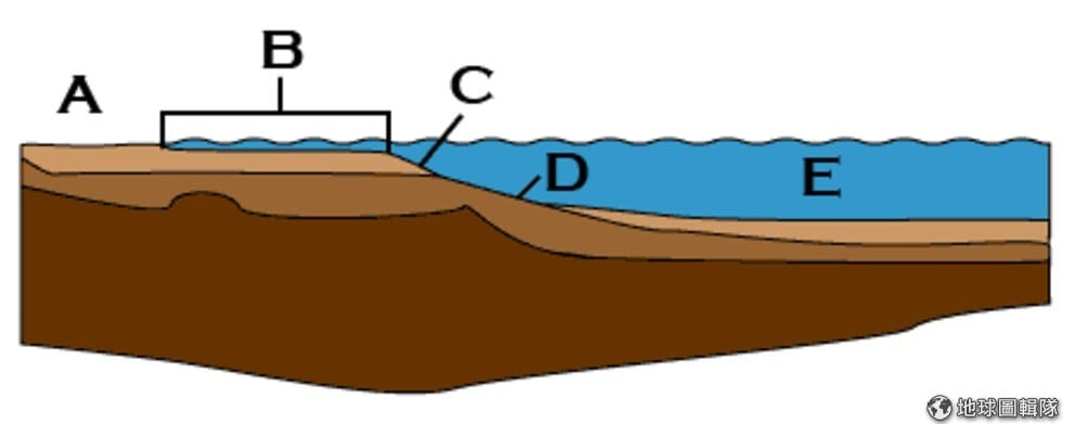 網友你知道海象都在哪一區覓食嗎?第一層淺咖啡色-沖積區;第二層褐色-岩石:第三層深咖啡色-地殼。A - 海岸;B - 大陸棚 ;C - 大陸坡:D - 陸基:E - 海洋。Photo credit: wikicommons