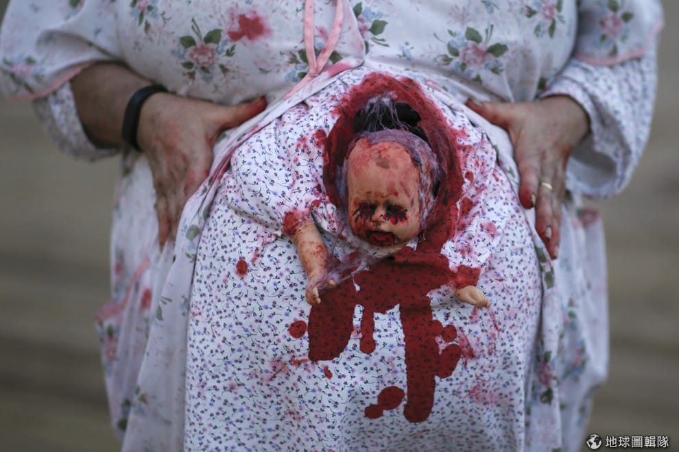 路透社一位參加民眾精心做出鬼娃誕生的模樣。