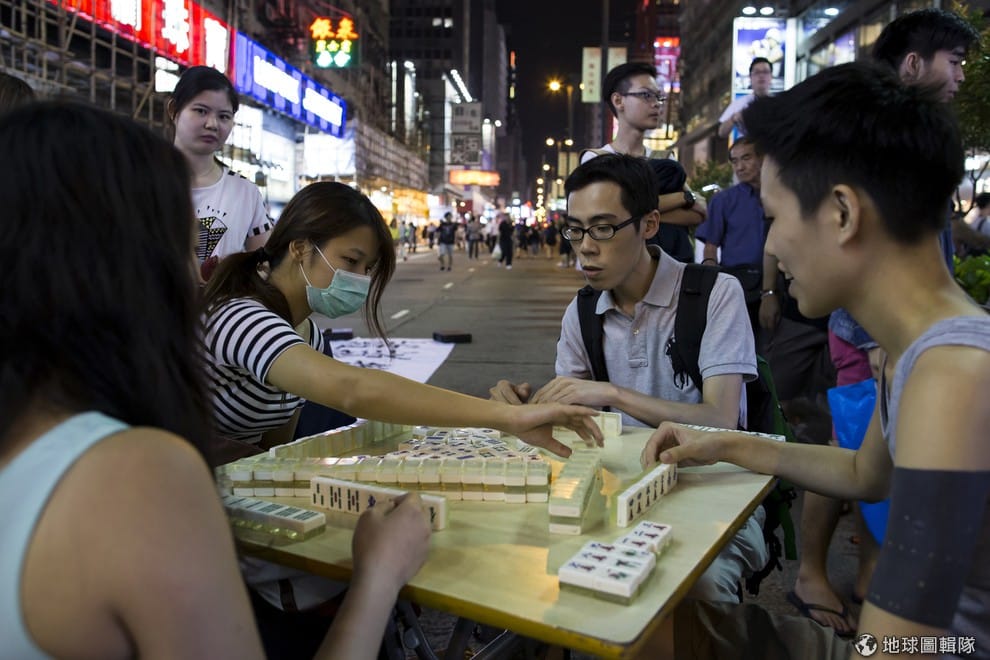 示威民眾在入夜後,直接在旺角大街上打起麻將