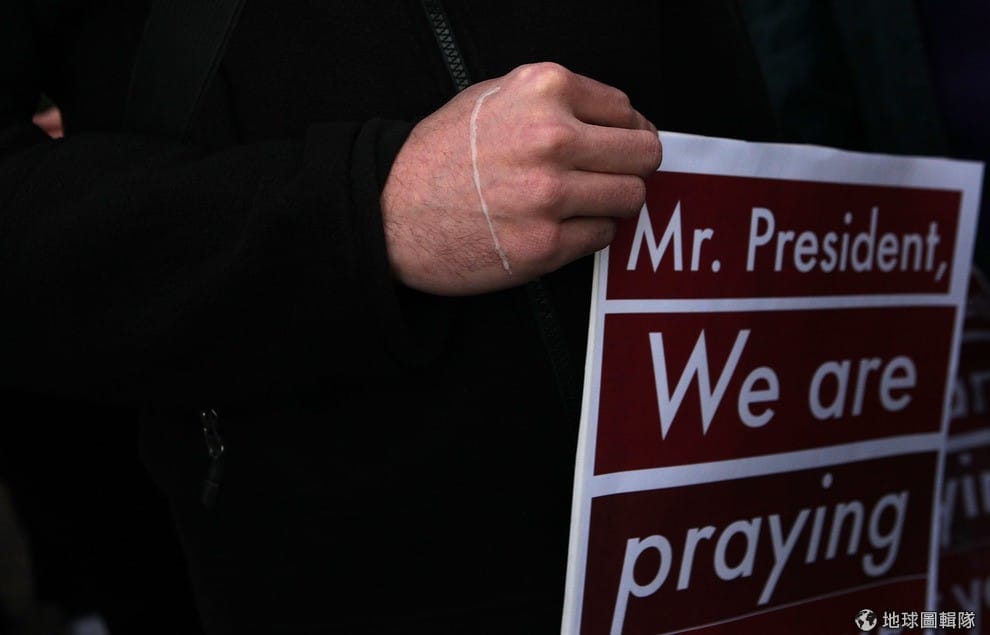 gettyimages「總統先生,我們正為了你的國家祈禱」禱告會上一名男子手拿標語,白色的蠟油滴落在手上,蠟燭已經燃盡。圖片來源:Alex Wong/Getty Images