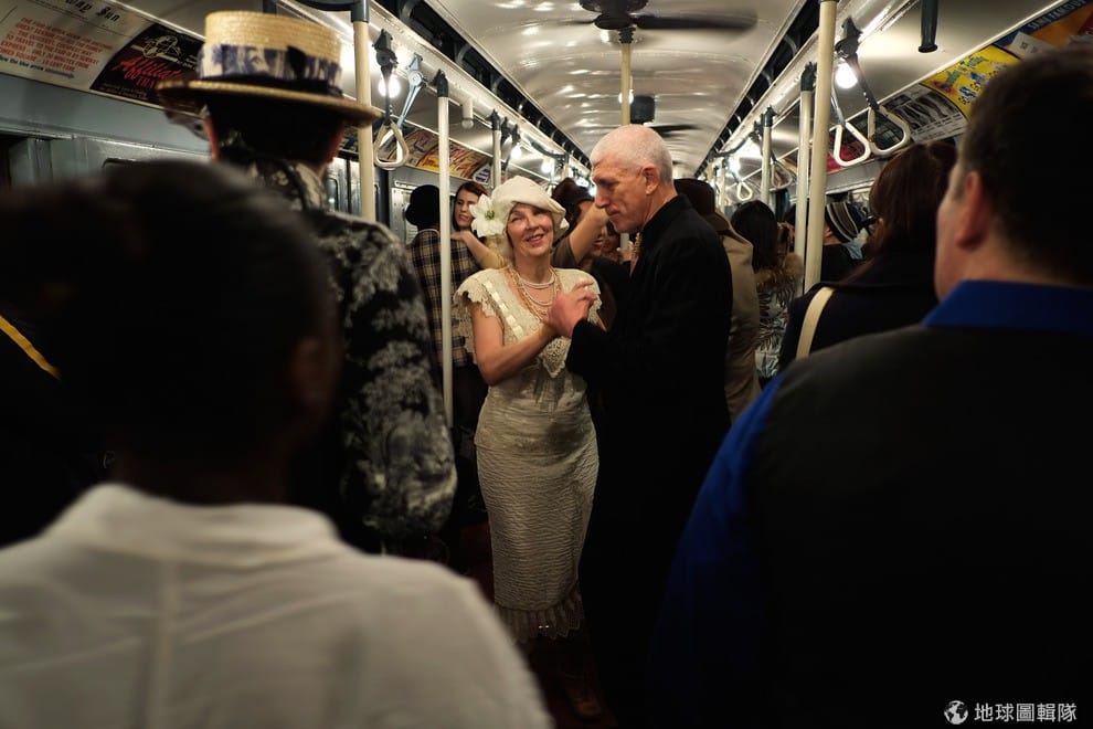 老爺爺和老奶奶穿上從前流行的服飾,手拉手在車廂內跳起舞。耳邊有沒有浮現6.70年代的經典老歌呢?圖片來源:Preston Rescigno/Getty Images