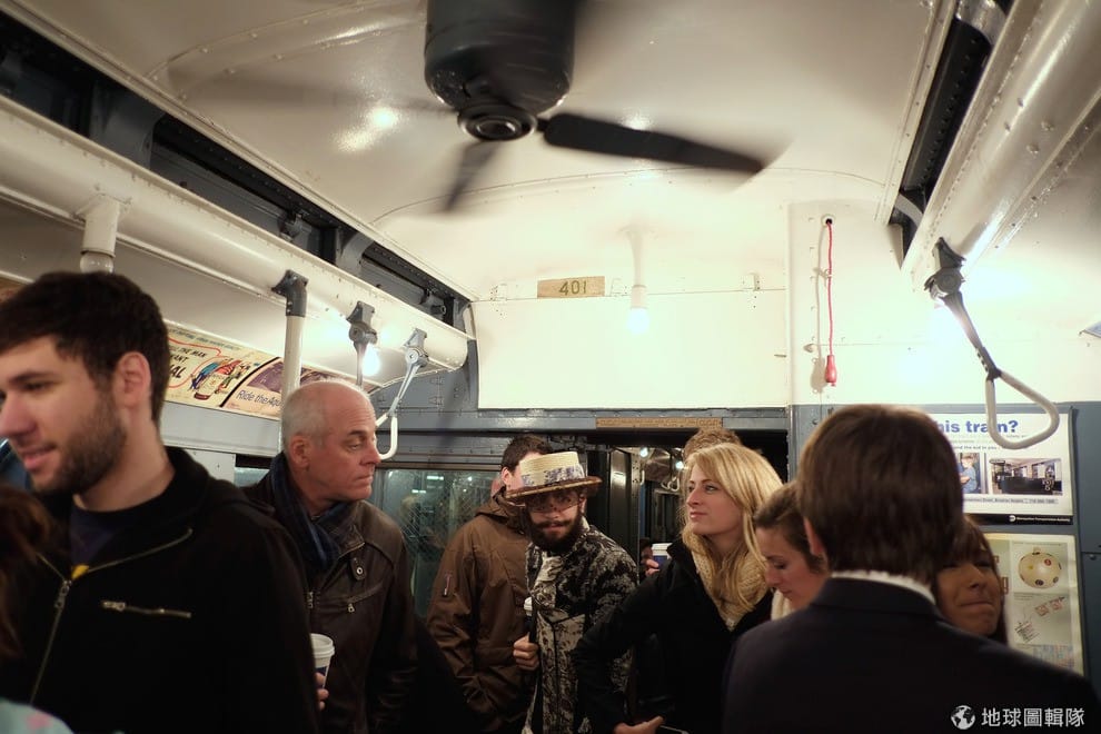 人們在復古的老車廂中穿梭,上方是舊式的電風扇啊!圖片來源:Preston Rescigno/Getty Images
