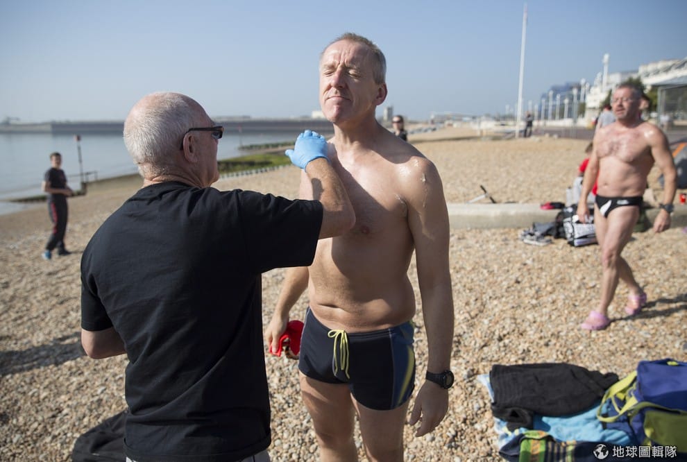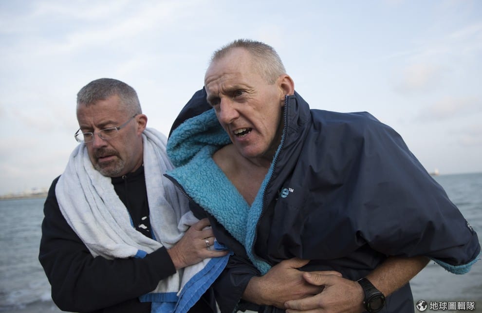 跑完140公里後抵達多佛海邊,他的團隊正替他溫暖身體,準備接下來泳渡英吉利海峽。