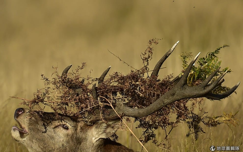 一隻雄性歐洲馬鹿正在里士滿公園裡吼叫,牠的頭上蓋著蕨類。