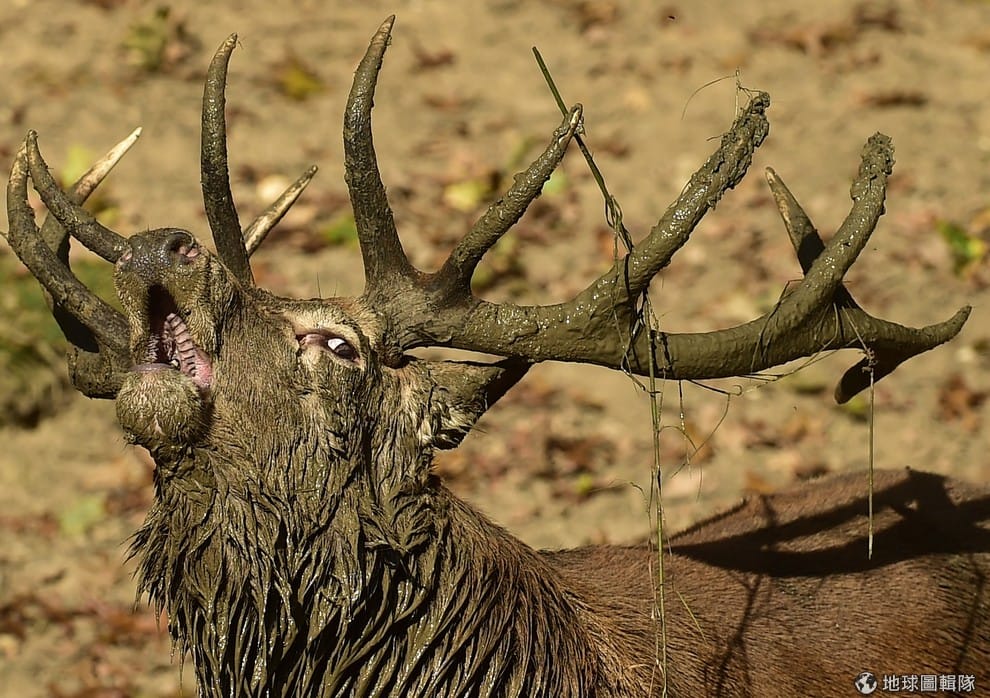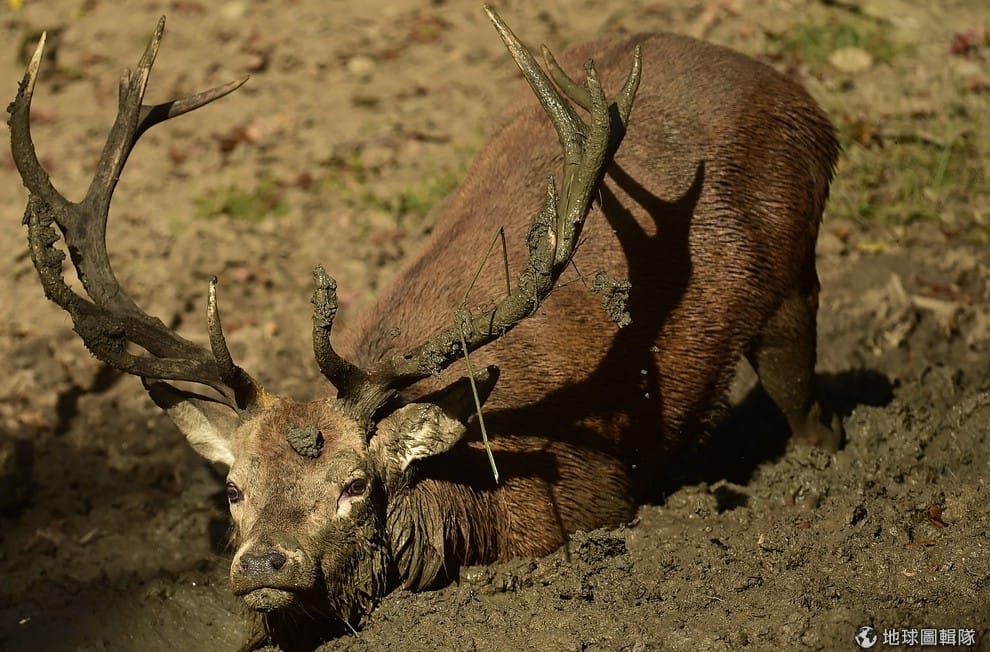 路透社身上沾滿爛泥巴的歐洲馬鹿。
