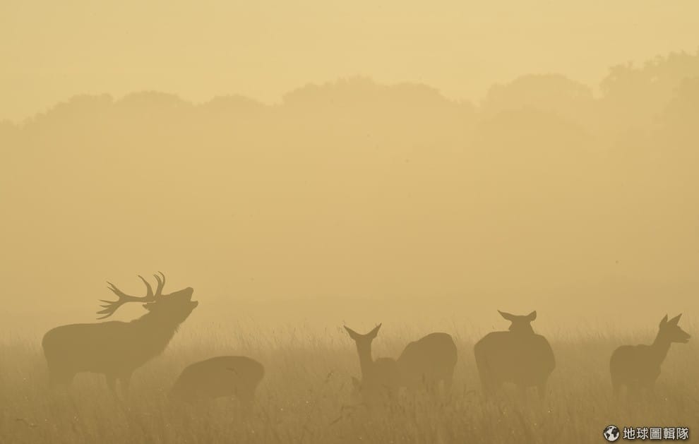 路透社清晨的時候,一隻公歐洲馬鹿抬頭對著天空吼叫。