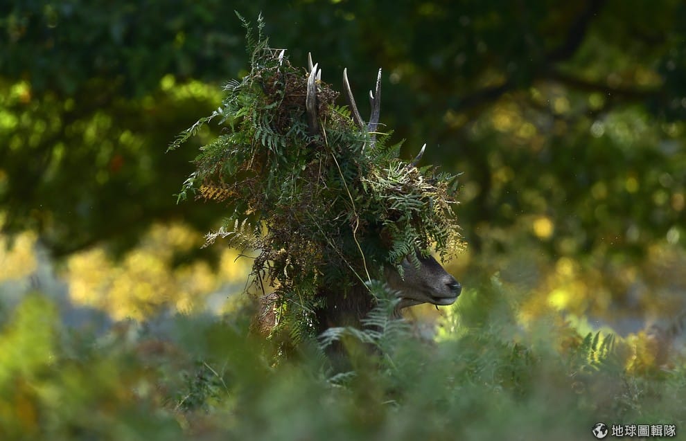 一隻雄性歐洲馬鹿站在草叢裡,頭上堆滿蕨類,甚至蓋到牠的眼睛。