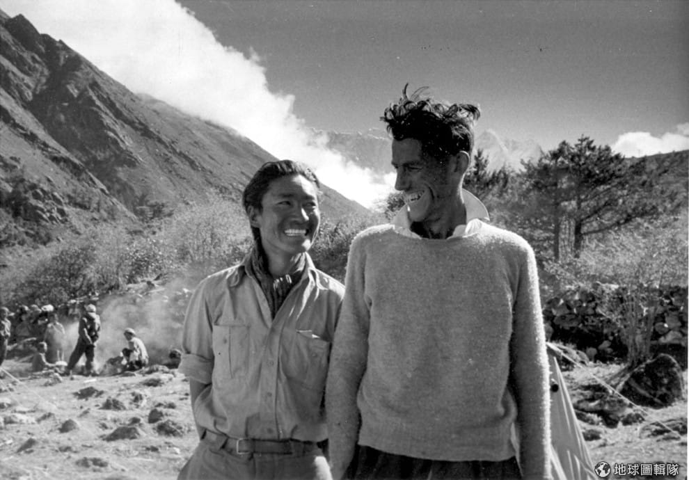 照片中是目前已知最早登上聖母峰的兩人,雪巴人諾爾蓋(左,Tenzing Norgay)以及紐西蘭登山家希拉瑞(Sir Edmund Hillary)。