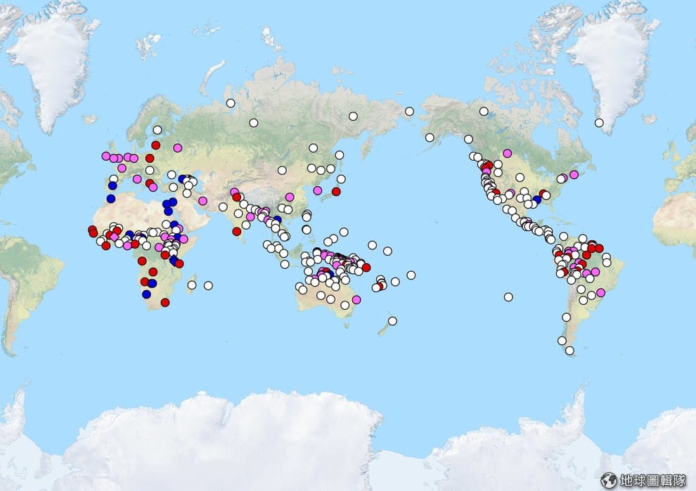 「語言結構世界地圖線上版」中,白色的圈圈代表中性的代名詞。