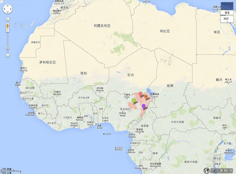 圖中4點就是綁架頻傳的地區,橘色A點代表博爾諾州,200多名女學生被綁就是發生在此處;下方紫色點代表阿達馬瓦州,也就是最新綁架案傳出的地區;綠色點是包奇州,這裡在綁架案同一天傳出炸彈攻擊消息;紅色點是約貝州,此處也和博爾諾州一樣,已經宣布進入「緊急狀態」長達一年以上的時間。