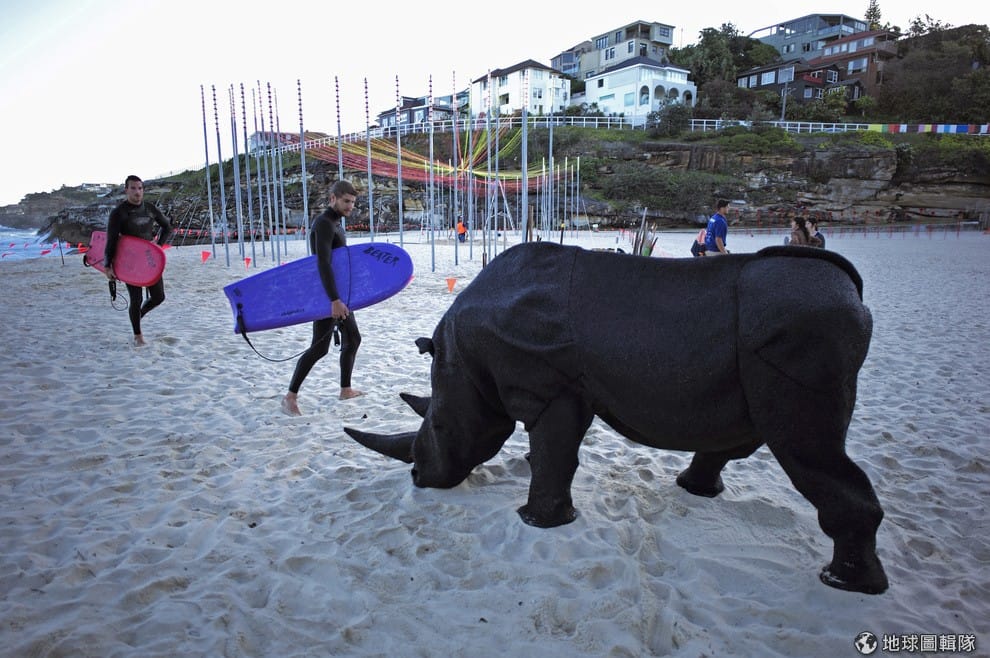 路透社衝浪客經過藝術家卡司特戴(Mikaela Castledine)的作品「犀牛的天賦」(Gift of the Rhinoceros)。