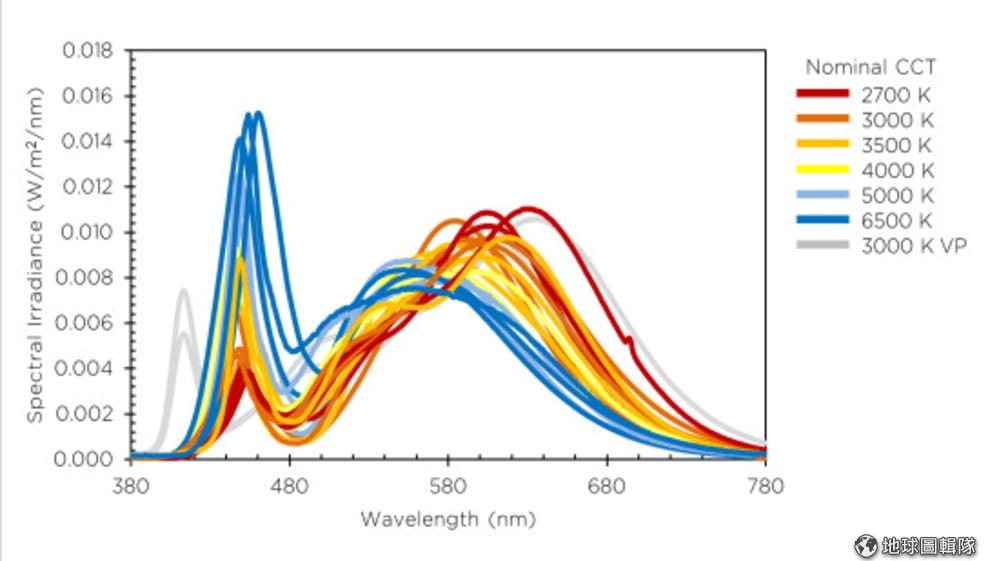合作夥伴色溫可做為評量光源的指標,暖光色溫較低,冷光色溫較高;色溫愈高的照明燈具,其藍光峰值也就愈明顯。根據光譜能量分布圖所示,色溫較高的白光 LED,其放射高峰值約在 450 nm 左右,同時也在波長 550 nm 到 650 nm 之間,呈現另一波峰值。DOE 表示,在波長約 400 nm 到 480 nm 藍光區光線下「過度」曝露,會導致視網膜受損。