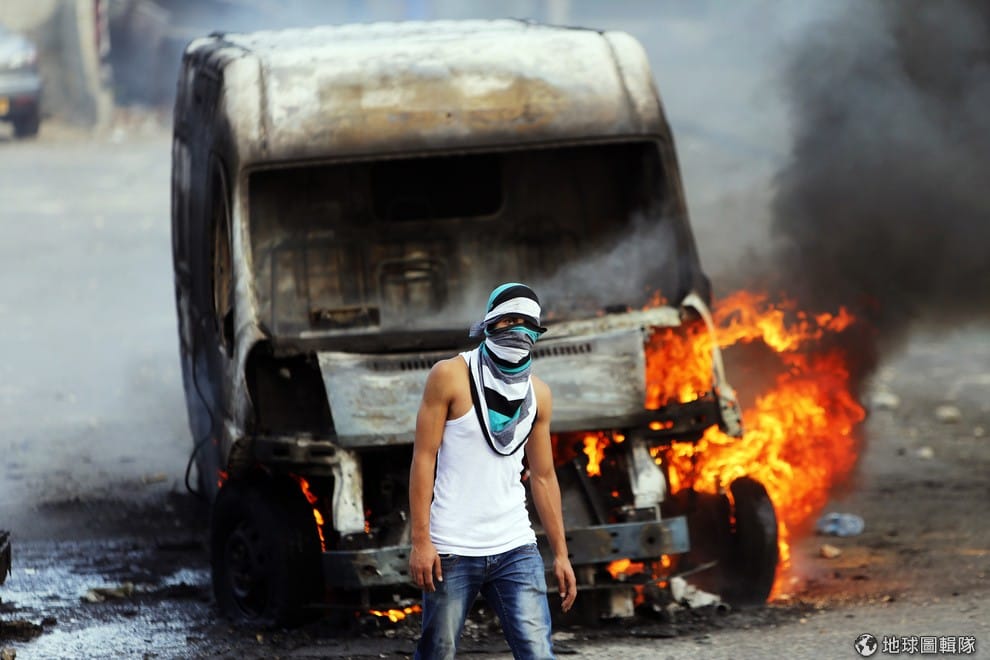 照片中的巴勒斯坦人站在被放火的車輛前,他和其他巴勒斯坦人不滿同胞被以色列軍方射殺,於是上街抗議,男子後方的車輛就是屬於以色列民眾。