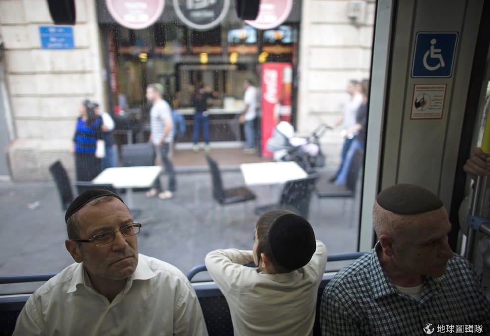 路透社帶著頭蓋骨便帽(Skullcap)的猶太人和小朋友一同搭車。