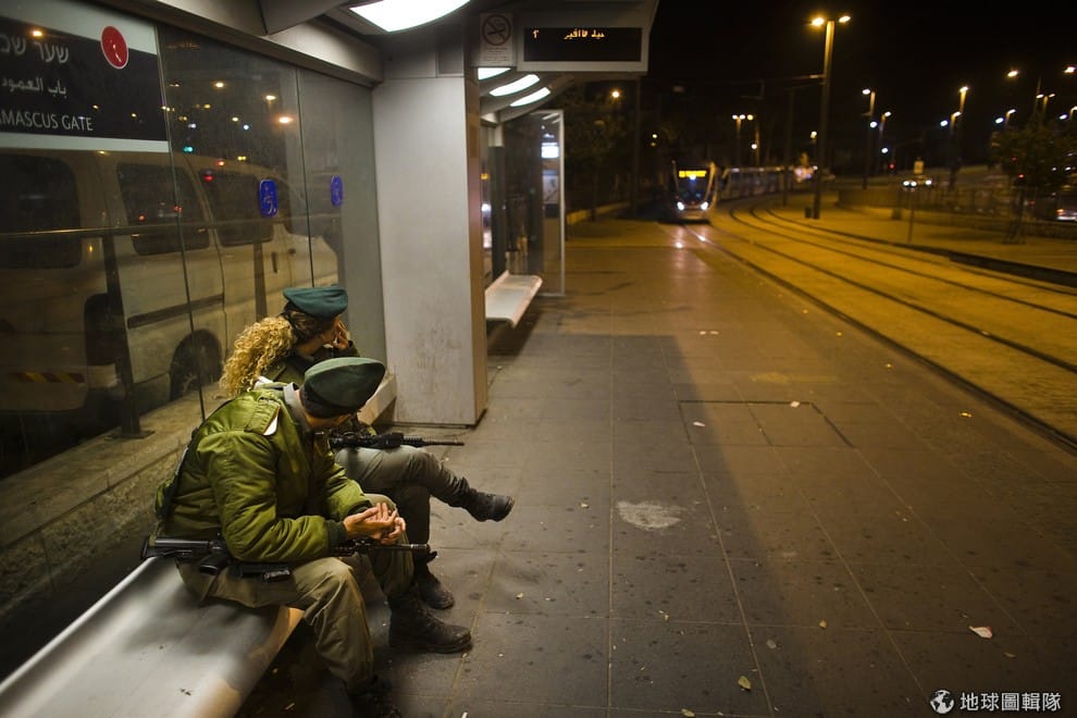 一群以色列邊防軍搭上電車