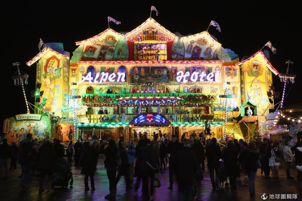 寫著「阿爾卑斯山旅館」的遊樂設施,有大量的燈火和人物彩繪,非常吸睛!難怪這個設施特別多人!圖片來源:Oli Scarff/Getty Images