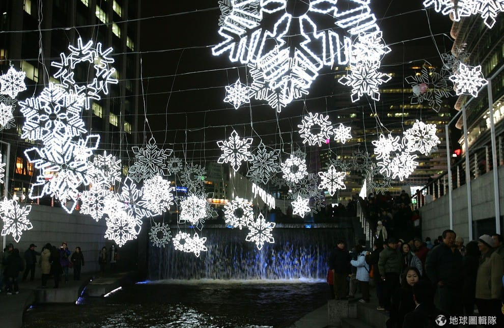 讓我們再飛回亞洲,照片中是2008年南韓以「嗨!首爾!」的主題來裝飾他們熱鬧的市區,點點雪花燈光,在夜色中非常的美麗。圖片來源:Chung Sung Jun/Getty Images