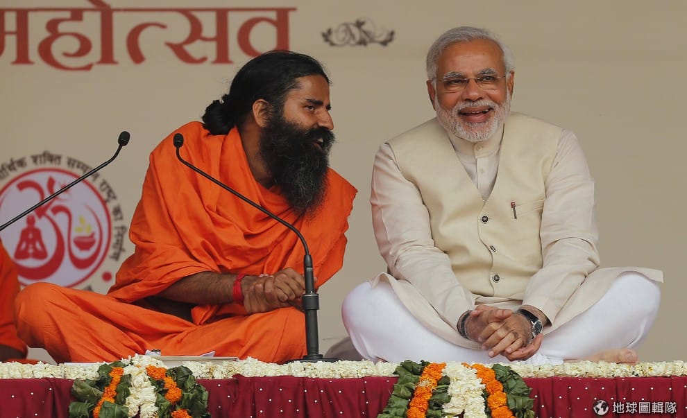 照片中右方是印度總理莫迪,他和印度知名的古魯導師坐在一塊。