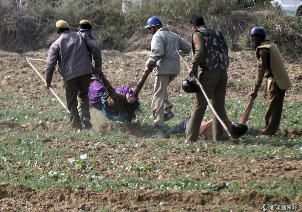 印度警方把阻擋他們逮捕行動的婦女抬到一旁去。