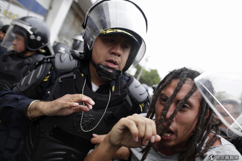 路透社墨西哥國際機場附近也出現抗議民眾,照片中的警察正在把示威者架走