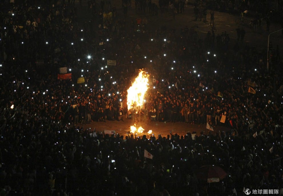 路透社民眾圍觀被大火燃燒的涅托總統假人