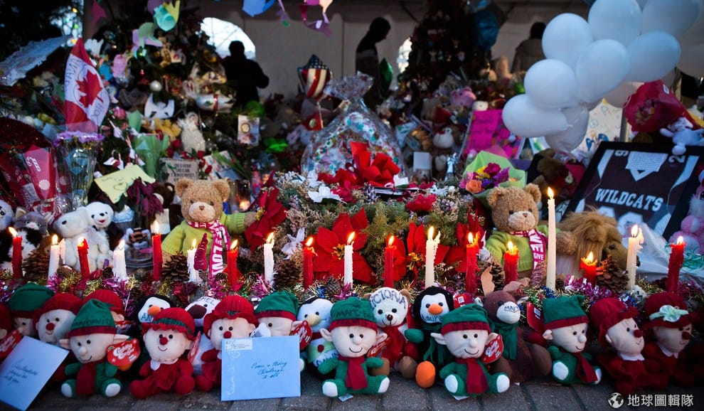 聖誕夜,民眾到弔念處點上燈火。希望他們的關懷能多少撫平受害者家人們的傷痛。圖片來源:Andrew Burton/Getty Images