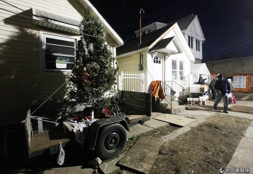民眾在臨時居住的帳篷旁邊放了大大的聖誕樹,希望聖誕燈火能為大家添一絲心頭暖意。圖片來源:Mario Tama/Getty Images