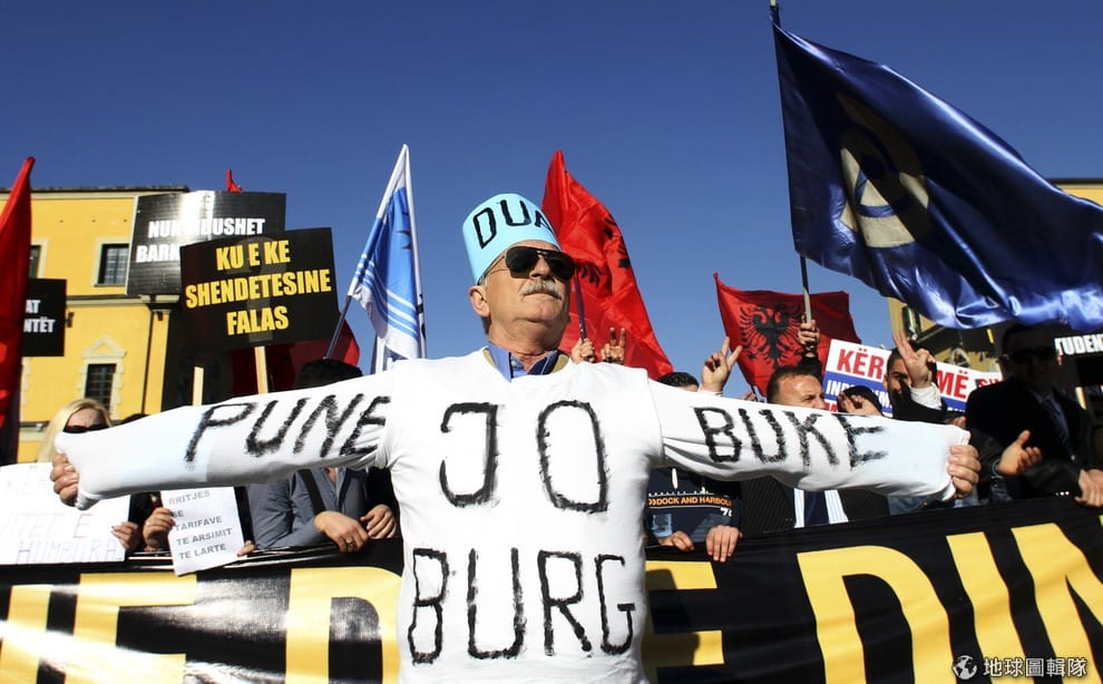 衣服寫著「我們要麵包和工作,不要坐牢」的民眾站在前方,他與其他人抗議政府提高稅制和電價的決定。