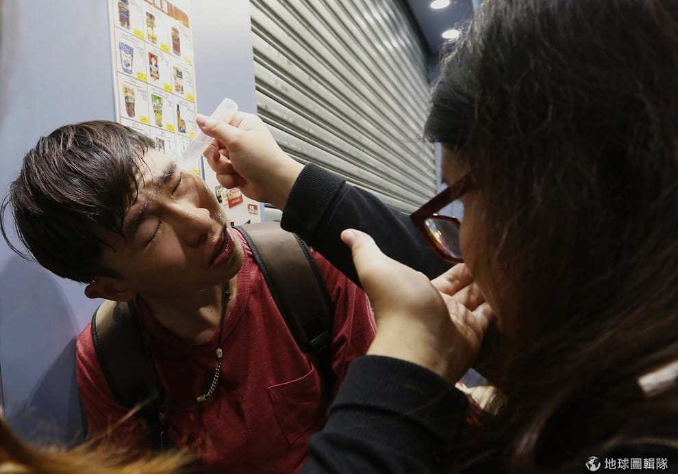 因為胡椒噴霧刺激到睜不開眼的學生正接受其他人協助
