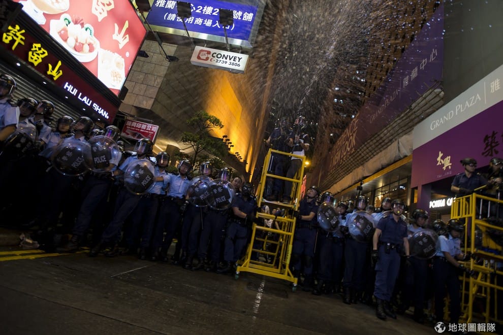 港警站在升降台上朝示威陣營噴灑胡椒噴霧