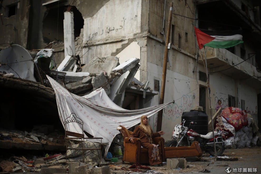 巴勒斯坦旗幟在一旁無力飄動,一名女性坐在已經被砲火波及毀壞的家園外,她表示自己的家在近期以色列和哈瑪斯組織的對戰中被毀掉。
