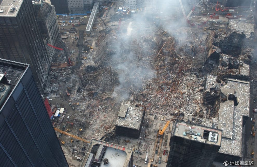 gettyimages持續燃燒的大樓遺址。圖片來源:2001/09/11; Mario Tama/Getty Images