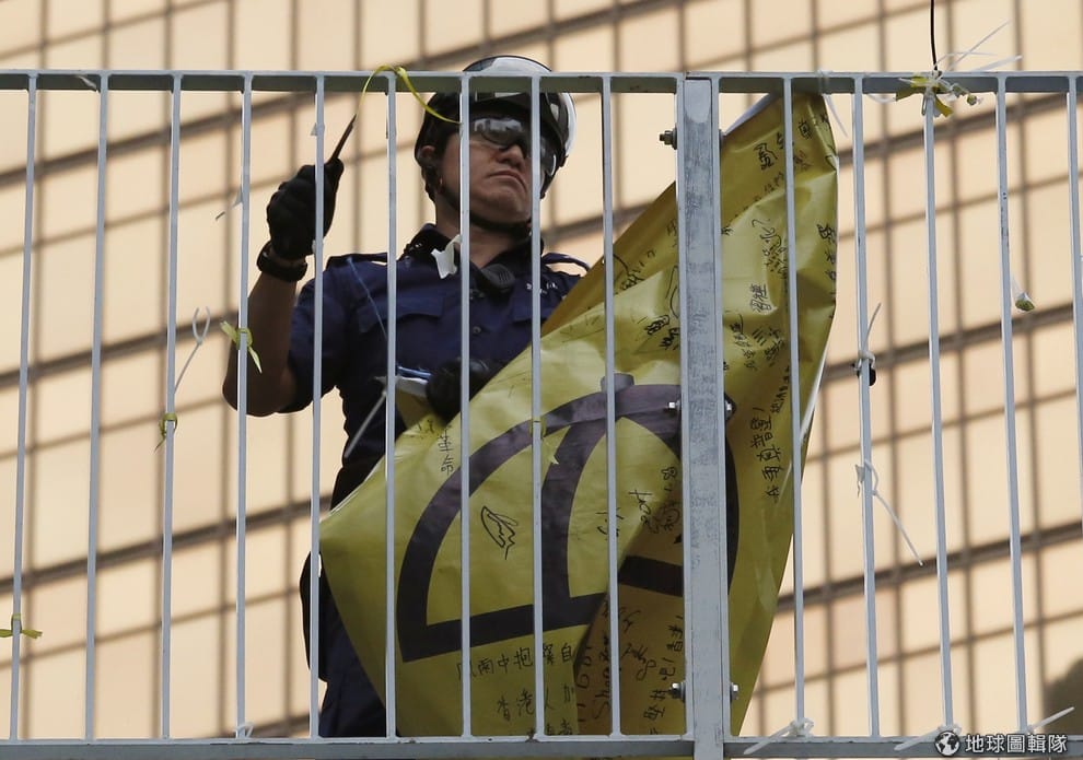 一名港警把佔中陣營的旗幟拆下